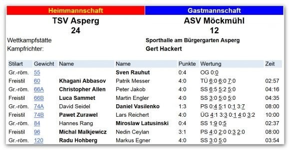 Deutlicher Sieg zum Saisonende (24 – 12) Am Samstag, den 08.12.2012 empfingen wir den ASV Möckmühl, in der Halle am Bürgergarten zu Gast. Für uns war es der letzte Kampf dieser Saison. Der Sieg, gegen die für uns uneinholbaren Tabellenzweiten aus Möckmühl, festigt unseren dritten Tabellenplatz vorübergehend. Ob wir diesen bis zum Ende der Gesamtsaison behalten, liegt nicht mehr in unseren Händen, sondern alleine bei der KG Neckar-Brücke, die in ihren zwei verbleibenden Kämpfen noch an uns vorbei ziehen könnte. Um uns aber auf den vierten Platz verdrängen zu können, müssen sie erstmal gegen den KSV Marbach und ASV Möckmühl gewinnen. So gesehen, haben die letzten zwei Kampftage, auch für uns noch eine gewisse Spannung. Zu den Kämpfen im Einzelnen: 55kg – G (0 – 4) (0 – 4) Die Punkte gingen kampflos an Sven Rauhut (ASV). 120kg – G (4 – 0) (4 – 4) Obwohl Markus Egner (ASV) gegen Radu Hohberg (TSV) gut mithalten konnte, setzte sich Radu am Ende der zweiten Runde entscheidend durch. Damit beendete Radu die Saison mit einer sauberen Weste, mit 14 Siegen in 14 Kämpfen. 60kg – F (4 – 0) (8 – 4) Khagani Abbasov (TSV) konnte sich gegen Patrik Messer (ASV) mit einer technischen Überlegenheit durchsetzen. Mit 13 Siegen in 14 Kämpfen, lässt sich auch seine Saisonbilanz sehen. 96kg – F (3 – 1) (11 – 5) Um fast zwei Gewichtsklassen nach oben gerückte Michal Malkjewicz (TSV). Bei dem Punktesieg gegen Nedin Ceylan (ASV) gab der sonstige 4´er – Kandidat, daher auch seine erste und einzige Runde in dieser Saison ab. Auch Michal blieb nach neun Kämpfen in dieser Saison unbesiegt. 66kg A – G (4 – 0) (15 – 5) Nachdem Christopher Allen (TSV) gegen Peter Jakob (ASV) die erste Runde durch 2 3´er – Wertungen gewinnen konnte, dominierte er zunehmend das Kampfgeschehen und konnte schließlich, in der dritten Runde einen Schultersieg erringen. Auch seine Saisonbilanz lässt sich sehen. Nachdem er in der Saison 2011 25% seiner Kämpfe gewinnen konnte, steigerte er sich in der Saison 2012 auf 55 % (6 Siege in 11 Kämpfen). 84kg – G (0 – 4) (15 – 9) Hannes Rang (TSV) musste gegen Miroslaw Latusinski (ASV) eine Schulterniederlage in der zweiten Runde hinnehmen. Hannes konnte 40% seiner Kämpfe für sich entscheiden. Wenn er öfters trainieren könnte, um seine konditionellen Fähigkeiten, seinem technischen Niveau anzupassen, dann wäre seine Siegesquote wesentlich höher. 66kg B – F (4 – 0) (19 – 9) Gegen Martin Engler (ASV) konnte Luca Sammet (TSV), nach zwei gewonnenen Kampfrunden, in der dritten Runde einen Schultersieg verbuchen. Seine Saisonbilanz liegt bei 57% (8 Siege in 14 Kämpfe). Die elegantesten Bewegungsabläufe der gesamten Mannschaft, hat er schon. Wenn er seine Kampftaktik bis zur nächsten Saison noch verfeinert, dann kann man davon ausgehen, dass sich auch seine Ergebnisse noch verbessern können. 74kg B – F (4 – 0) (23 – 9) Obwohl Pawet Zurawel (TSV) bereits zu Beginn des Kampfes, gegen den zu schweren Lars Reichert (ASV), als Sieger feststand, war dieser, über die volle Länge gerungene Freundschaftskampf der Beiden, der wohl Spannendste für die Zuschauer. Jetzt weiß auch Pawet, wie es sich anfühlt, 10 Minuten zu ringen. Obwohl er noch nicht so lange ringt, kann auch Pawet eine Quote von 46 % (5 Siege in 11 Kämpfe) vorweisen. Man konnte während der Saison beobachten, wie bei ihm, jede neue Kampferfahrung in den nächsten Kampf mit einfloss. 74kg A – G (1 – 3) (24 – 12) Im letzten des Abends konnte sich David Seidel (TSV) gegen den starken Daniel Vasilenko (ASV) nicht durchsetzten. In einem lange Zeit offenen Kampf, konnte er eine Runde für sich verbuchen. Ich hoffe inständig, dass David nach seinem ersten Kampf in der nächsten Saison eine Kiste Bier mitbringt, um seine Wettschulden zu bezahlen, denn mit dem Ende dieser Saison kündigte er auch das Ende seiner (sehr langen, ca. seit dem Aussterben der Dinosaurier) aktiven Ringerlaufbahn an, was zu dieser Wette führte. Nicht nur, dass wir ihm die Kiste Bier nicht gönnen, wir wären auch ALLE traurig, wenn wir unseren Urgestein in der Mannschaft verlieren würden. Zum Abschluss und nicht zuletzt, möchten wir uns bei unseren treuen Helfern und Fans für ihre Unterstützung während dieser Saison bedanken.