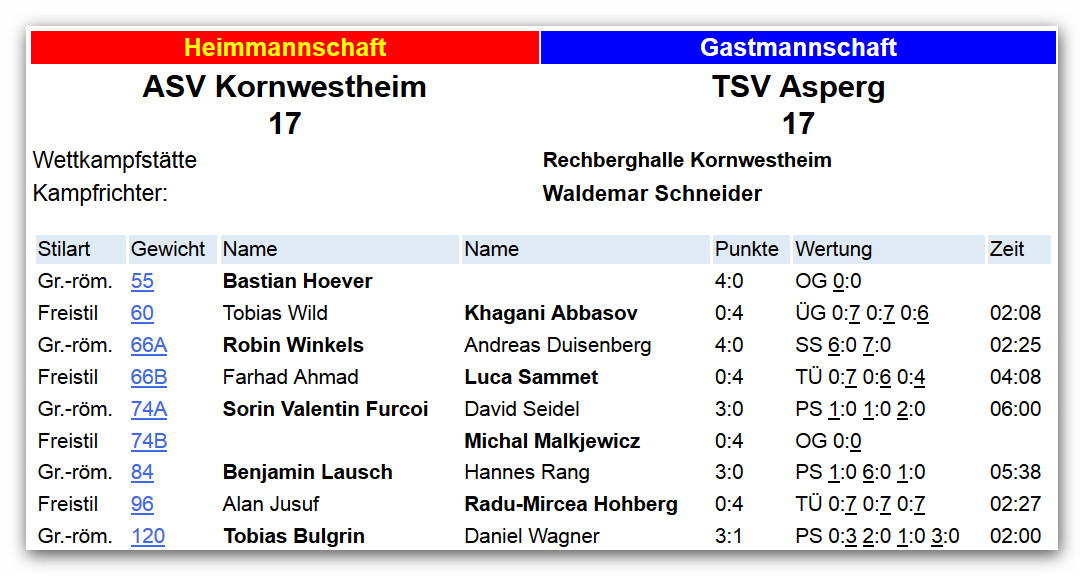 Unentschieden gegen den ASV Kornwestheim (17 – 17) Am Samstag, den 17.11.2012 waren wir beim ASV Kornwestheim zu Gast. Da der 120´er ASV-Ringer Julian Bulgrin am heutigen Abend ausgefallen war, konnte das von einigen erwartete Duell, der noch unbesiegten Punktegaranten Tobias Bulgrin (ASV) und Radu Hohberg (TSV), aus taktischen Gründen, seitens der Kornwestheimer nicht stattfinden. Dass dies die richtige Entscheidung war, sollte sich aus Sicht der Kornwestheimer noch im Laufe des Kampfabends herausstellen. Zu den Kämpfen im Einzelnen: 55kg – G (0 – 4) (0 – 4) Die Punkte gingen kampflos an Bastian Hoever (ASV). 120kg – G (1 – 3) (1 – 7) In einem engen Kampf über vier Runden, konnte Daniel Wagner (TSV) dem Trainer Tobias Bulgrin (ASV) eine Kampfrunde abnehmen und somit erheblich zum Endergebnis beitragen. 60kg – F (4 – 0) (5 – 7) Obwohl Khagani Abbasov (TSV) gegen Tobias Wild (ASV) bereits auf der Waage gewonnen hatte, konnte er auch alle Kampfrunden auf der Matte, durch technische Überlegenheit für sich entscheiden. 96kg – F (4 – 0) (9 – 7) Gegen den jungen Athleten Alan Jusuf (ASV) konnte Radu Hohberg (TSV) einen Überlegenheitssieg in drei Runden erzielen. Besonders erfreulich war auch die vom Hallesprecher hervorgehobene Fairness des Asperger Athleten. 66kg A – G (0 – 4) (9 – 11) Andreas Duisenberg (TSV) musste gegen Robin Winkels (ASV) eine Schulterniederlage hinnehmen. Trotz einer Niederlage, ist es für ihn eine wertvolle Erfahrung, denn Kampferfahrung kann man nicht im Training, sondern nur im Wettkampf sammeln. 84kg – G (0 – 3) (9 – 14) Hannes Rang (TSV) konnte die Niederlage gegen Benjamin Lausch (ASV) in Grenzen halten, was auch ein erheblicher Beitrag zum Endergebnis war. 66kg B – F (4 – 0) (13 – 14) Einen ungefährdeten Sieg durch technische Überlegenheit in drei Runden, konnte Luca Sammet (TSV) gegen Farhad Ahmat (ASV) verbuchen. 74kg B – F (4 – 0) (17 – 14) Kampflos kam Michal Malkjewicz (TSV) zu seinen Punkten und brachte dadurch den TSV wieder in Führung. 74kg A – G (0 – 3) (15 – 17) Der letzte Kampf des Abends konnte nun Alles in alle Richtungen entscheiden. In einem Kampf über drei Runden, der Einige auf beiden Seiten die Stimmbänder gekostet haben dürfte, konnte sich Sorin Furcoi (ASV) gegen David Seidel (TSV), in jeder Runde ganz knapp durchsetzen. Obwohl wir gerne die vollen Punkte mit nach Hause genommen hätten, geht das Unentschieden nach einem spannenden Kampfabend, gegen die sympathischen Kornwestheimer, voll in Ordnung. Am Samstag, den 24.11.2012, um 19:30 Uhr, erwarten wir den VFL Neckargartach, bei uns in der Bürgergarten-Halle zur Gast.