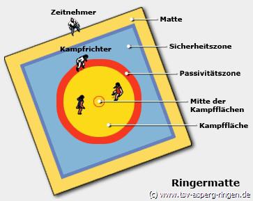 Sicherlich haben sich schon viele Zuschauer und Leser über unsere Designermatten gewundert, in, mittlerweile wieder, topmodischen Retro-Trendfarben wird unser Ringkampfbereich in 3 Zonen Unterteilt. Der äußere Bereich, auch Out-Zone genannt, wird durch ein „old-school“ Blau hervorgehoben. Befindet man sich in diesem Bereich, so pfeift der Mattenrichter im Normalfall ab und lässt den Kampf wieder von der Mattenmitte aus beginnen. Der nächste Bereich ist ein etwa 1 Meter breiter Ring in roter Farbe. Hier weiß der Ringer, dass er wieder zur Mattenmitte hinarbeiten muss, damit er nicht rausgeschoben wird und möglicherweise einen Punkt abgibt. Der innere Bereich, die „Fight-Zone“ ist in einem besonders modischen Gelb gehalten und praktisch der Hauptkampfbereich. Hier spielt sich also das Wesentliche Kampfgeschehen ab. Zusätzlich befindet sich ein weißer Ring in der Mitte der Matte, dieser dient zur Orientierung und ist Ort des Kampfbeginns.