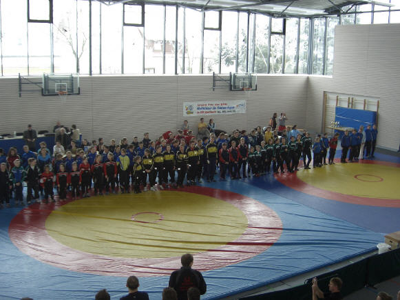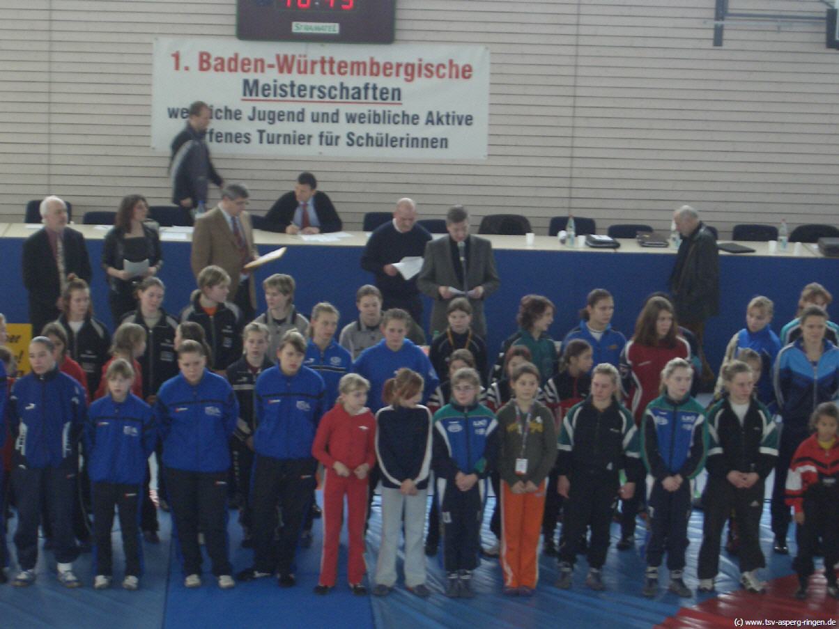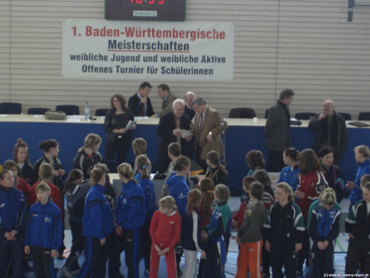 WRV Vizepräsident Günter Prexl zeigte sich über die große Zahl der Teilnehmerinnen positiv überrascht und ehrte Ulrich Meyer für seine Verdienste um den Ringkampfsport mit der silbernen Ehrennadel des württembergischen Ringerverbandes. Alice Barth eröffnete die Meisterschaften, die durch die Jazz Company des TSV Asperg schwungvoll eingeleitet wurden.