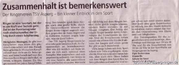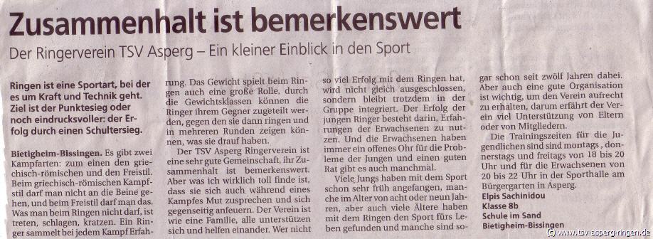 Bericht aus der Bietigheimer Zeitung. von Elpis Sachinidou, Klasse 8b Schule im Sand Bietigheim-Bissingen