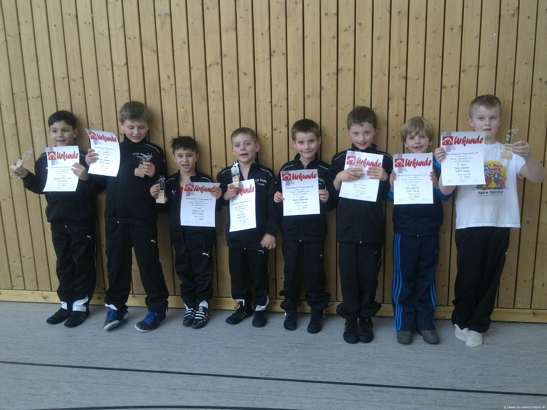 In der E-Jugend trat Alessio Casto in der Gewichtsklasse bis 20 kg an. In allen 4 Kämpfen konnte er sich gegen seine Gegner durchsetzen und zeigte dabei immer wieder schnelle Angriffe. Am Ende wurde er verdientermaßen Turniersieger. In der Gewichtsklasse bis 23 kg trat erstmals Teoman Yetim an. Bei seinem ersten Turnier war ihm in den ersten Kämpfen noch deutlich die Nervosität und auch die noch fehlende Kampfpraxis anzumerken. Er steigerte sich dann aber von Kampf zu Kampf und konnte sich in der mit 7 Ringern gut besetzten Klasse am Ende noch bis auf den 4. Rang vorkämpfen - ein toller Einstieg in die Ringkampfpraxis. In der Gewichtsklasse bis 24 kg waren mit Leonel Fendrich und Talha Alkan gleich zwei Ringer für den TSV am Start. Für Talha, der erst im Januar 6 Jahre alt geworden ist und gegenüber seinen Kontrahenten deutlich jünger war, war es das erste Turnier. Auch ihm war noch die Nervosität und die noch fehlende Kampfpraxis anzumerken. Bei den ersten Kämpfen musste er sich noch deutlich geschlagen geben, steigerte sich aber von Kampf zu Kampf. Am Ende musste er sich aber mit Platz 6 zufrieden geben. Mit zunehmender Kampfpraxis sind hier aber in Zukunft deutlich bessere Platzierungen zu erwarten. Leonel konnte an diesem Tag insbesondere bei den ersten Begegnungen leider noch nicht zu seiner gewohnten Stärke finden. Nach zwei unerwarteten Niederlagen aber kämpfte er sich zurück in das Turnier und konnte am Ende noch den achtbaren 4. Platz ergattern. Mit etwas Glück hätte er noch den 3. Platz erreichen können. Auch in der Gewichtsklasse bis 25 kg waren mit Luca Mazzei und Ole Augustin wieder zwei Athleten für Asperg am Start. Bereits im ersten Kampf verschenkte Luca dabei den späteren Turniersieg. Deutlich in Führung liegend, ließ er sich von einem Pfiff des Kampfrichters auf der Nachbarmatte irritieren. Sein Gegner nutzte diese Unaufmerksamkeit und konnte ihn auf die Schultern zwingen. Seine weiteren Kämpfe konnte Luca dann aber für sich entscheiden und sich am Ende hochverdient als Zweitplazierter feiern lassen. Ole startete wieder recht nervös in das Turnier; jedoch zeigte er gleich im ersten Kampf, was für ein Kämpferherz in ihm steckt. Obwohl er bereits deutlich nach Punkten zurücklag, gab er nie auf und konnte kurz vor Kampfende seinen Gegner noch auf die Schultern zwingen. Bei den weiteren Kämpfen in der stark besetzten Gruppe musste er leider noch eine weitere Niederlage einstecken. Im letzten und entscheidenden Kampf zeigte er gegen den späteren Turniersieger wieder einen sehr beherzten Kampf und musste sich nach drei hart umkämpften Runden nur ganz knapp nach Punkten geschlagen geben. Am Ende blieb ihm leider nur der undankbare 4. Platz. Paul Gutbrod trat in der Gewichtsklasse bis 29 kg an. In einer sehr stark besetzten Gruppe konnte er sich im ersten Kampf mit schönen Beinangriffen vorzeitig gegen seinen Gegner entscheidend durchsetzen. Im zweiten Kampf kam es zum vorgezogenen Finale. Beide Athleten zeigen einen Kampf auf hohem technischen und taktischen Niveau. Leider musste sich Paul dann aber nach einer kleinen Unaufmerksamkeit entscheidend geschlagen geben. Im letzten Kampf spielte Paul wiederum seine ganze Routine aus; nachdem er sich gleich zu Beginn des Kampfes mit viel Ehrgeiz aus einer brenzlichen Situation befreien konnte, diktierte er das weitere Kampfgeschehen und konnte mit einem Kontergriff seinen Gegner auf die Schultern zwingen. Am Ende konnte auch er sich hochverdient als Zweitplazierter feiern lassen. Samuele Casto startete in der Gewichtsklasse bis 31 kg. Auch bei ihm war im Vergleich zum letzten Turnierbesuch eine deutliche Steigerung insbesondere im taktischen Verhalten zu erkennen. Durch seinen immensen Siegeswillen konnte er sich in allen drei Kämpfen vorzeitig entscheidend durchsetzen und all seine Gegner auf die Schultern zwingen. Verdientermaßen nahm er am Ende als stolzer Turniersieger die Glückwünsche entgegen.