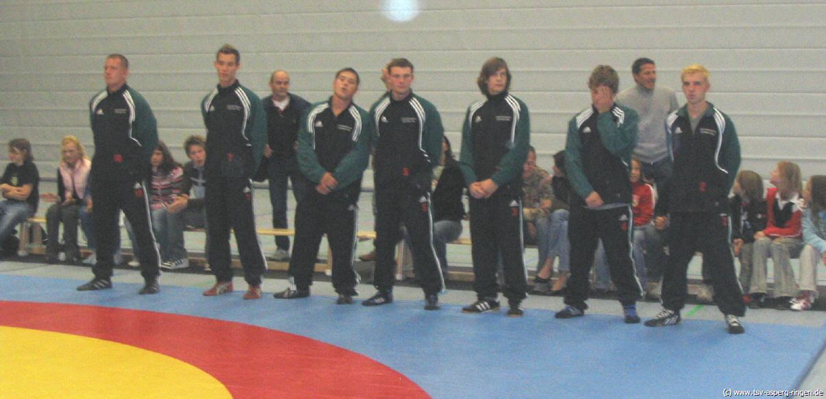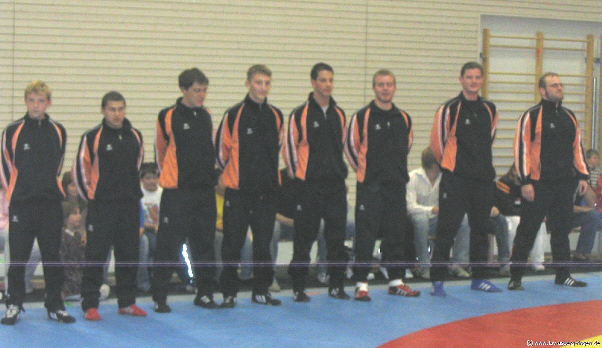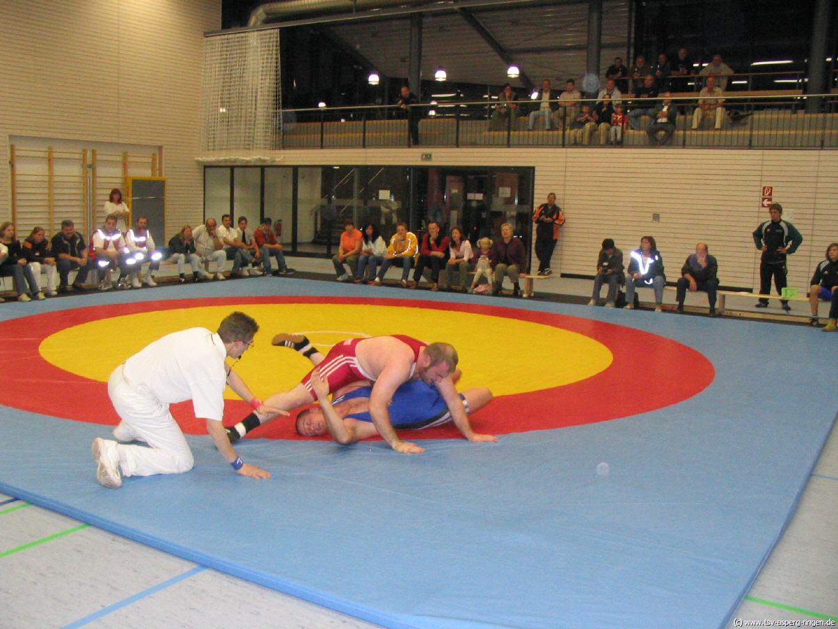 Die Kämpfe im Einzelnen: Artur Minz konnte auch beim zweiten Mannschaftskampf seiner Laufbahn wieder die volle Punktzahl einfahren. Simon Fingerle bewies gegen den Ernst Pfahl seine großartige Form erneut und holte 3:0 Mannschaftspunkte. Vitalij Scheer beherrschte Marcel Jung jederzeit und siegte in der zweiten Runde auf Schulter. Fabian Prexl zwang mit seiner gewohnt rustikalen Ringweise Christian Müller zur Aufgabe. Zur Pause hatte der TSV II einen Zwischenstand von 15:0 erzielt und hatte somit den Mannschaftserfolg schon fast sichergestellt. Christopher Allen beherrscht Marvin Hofsäß jederzeit und siegte in der ersten Runde entscheidend. Mit diesem Sieg des jungen Aspergers stand der Mannschaftserfolg endgültig fest. Calvin Fingerle stand dem erfahrenen Michael Hampp gegenüber. Mit 0:3 schlug sich Fingerle prächtig. Hannes Rang konnte erstmals in diese Saison antreten. Der 3:0 Punktsieg gegen Christian Jung stand nie in Frage. Ganz schwer hatte es Daniel Pantle gegen den sehr starken Holger Hainle. Immerhin gelang Pantle nach seiner langen Verletzungszeit der Ehrenpunkt gegen den bärenstarken Neckarweihinger. Endstand des Mannschaftskampfs 22:7 für den TSV.