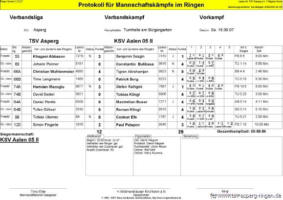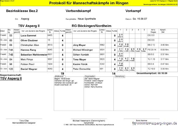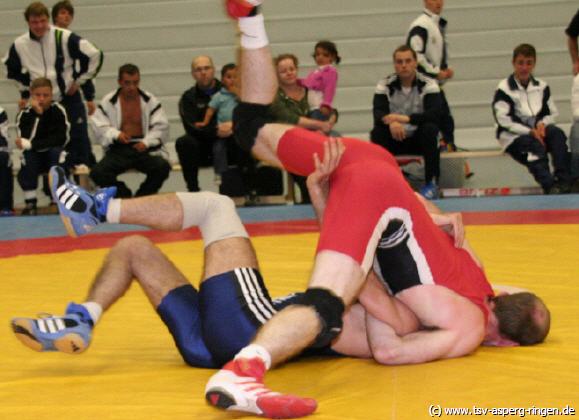 Die Kämpfe im Einzelnen: TSV Asperg II – RG Böckingen / Nordheim 55kg / Freistil Luca Sammet wurde Kampfloser Sieger. Asperg 4 : Böckingen/Nordheim 0 120kg / Gr. Römisch Unser Titan Daniel Wagner dominierte den Kampf gegen Peter Domschitz und konnte sich nach drei Runden als technisch Überlegener feiern lassen. 8:0 60kg / Gr. Römisch Oliver Daubner wurde Kampfloser Sieger. 12:0 96kg / Freistil Fabian Prexl hatte mit Kasimir Yöruk keine leichte Aufgabe zu bewältigen. Nach einer unachtsamen Aktion musste sich Fabian leider auf Schulter geschlagen geben. 12:4 66kg / Freistil Auch Christopher Allen hatte Probleme seine Stärken gegen Jörg Mayer zu zeigen. Als er gerade dazu neigte seinen Ringstil zu entfalten, lief er leider in einen Konter des Gegners und musste sich auf Schulter geschlagen geben. 12:8 84kg / Gr. Römisch Mit Timo Mayer hatte Maic Firnys den Leistungsträger der Gästemannschaft zum Gegner. Mit tollem Kampfgeist ließ sich unser Maic aber nicht unterkriegen und zeigte durchaus schöne Aktionen. Nach drei Runden wurde aber der Gegner zum verdienten Sieger gekürt. 12:12 74kg / Gr. Römisch Einen super Kampf über die volle Zeit und mit vielen Punkten lieferten sich Hannes Rang und Michael Mössinger. Der ausgeprägte Wille unseres Astrokinetik Studenten waren dann ausschlaggebend für den Sieg unseres Ringers. 15:14 74kg / Freistil Sebastian Wahlenmeier zeigte seinem Gegner Gökan Kundak wer Chef im Ring war und Schulterte ihn nach nur 47s souverän. Endstand 19 : 14 für den TSV II, eine super Leistung und weiterhin Tabellenführung, was will man mehr...