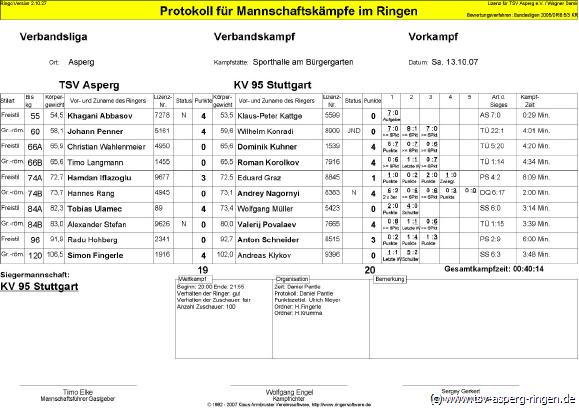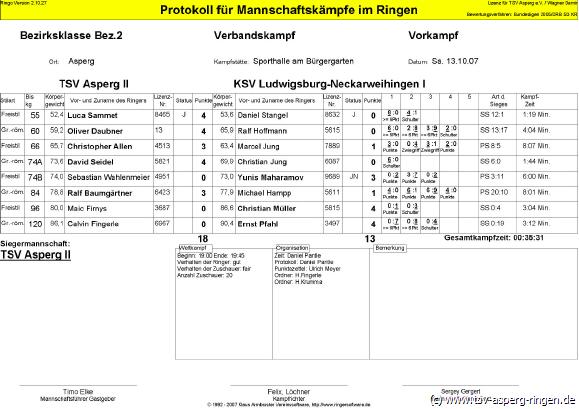 55kg – Luca Sammet zeigte gegen Daniel Stangel mal wieder Top Leistung und wurde endlich mit einem verdienten Schultersieg belohnt. 120kg – Calvin Fingerle, im Dienste der Mannschaft diesmal im Schwergewicht zu finden, hatte mit Ernst Pfahl, eine Legende der hiesigen Ringerkultur (legendärer Sieg über Timo Elke), als Gegner. Hier ließ die Routine der Jugend keine Chance und Calvin verlor undankbar auf Schulter. 60kg – Oliver Daubner wieder im Dress des TSV, wie immer mit 100% Willen und Freude beim Sport, ließ seinem Gegner Ralf Hoffmann nicht viel Chancen und gewann souverän auf Schulter. 96kg – Maic Firnys hatte die undankbare Aufgabe im Freistil gegen Christian Müller zu Ringen. Mit guten Ansätzen konnte er kurz glänzen, bevor er entscheidend den Kampf verlor. 66kg – Christopher Allen wird vielleicht doch noch ein Freistilringer. In diesem Kampf gegen Marcel Jung bewies er auf jeden Fall mal wieder kämpferische Stärke und zeigte eine aktionsreich geführten Kampf, den er schließlich mit 3:1 Wertungspunkten für sich entscheiden konnte. 84kg – Ralf Baumgärtner - wenn der nur mal richtig trainieren würde, dann wäre er eine Ikone im Asperger Ringsport. Aber auch so ist er ein wertvoller Wegbereiter für die Siege der 2. Mannschaft. Auch Michael Hampp konnte sich gegen unseren Ralf nicht behaupten, der eine leidenschaftlichen Kampf absolvierte, ehe er sich als Sieger feiern lassen konnte 74kgA –David Seidel zum Kräfte sammeln in die „Zweite“ gestellt, zeigte seinem Gegner Christian Jung welch riesiges Trainingspensum er dieses Jahr absolviert hatte. Nach schönen Aktionen holte sich unser David ein von seinen Mannschaftskameraden gefeierten Schultersieg. Geht doch... 74kgB – Sebastian Wahlenmeier hatte mit Yunis Maharamov einen starken Gegner zu bewältigen. In einem hitzigen Kampf konnte „Basti“ aber seine genetischen Stärken nicht zum Einsatz bringen und verlor denkbar knapp nach Punkten. Ein verdienter 18:12 Sieg unserer Zweiten Mannschaft, die sich aufmacht die Tabellenspitze erneut zu erklimmen. Top Leistung, Top Mannschaft.
