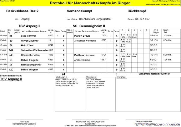 Da die Gemmrigheimer Ersatzstaffel nur mit 4 anstatt mit 8 Ringern antraten, gewann unsere Zweite schon auf der Waage mit 32:0. Sicherlich sind solche Kämpfe nicht besonders schön für den Ringsport aber manchmal steht man vor solchen Situationen, das die Ringer krank sind,wir hoffen das die Gemmrigheimer Ringer alle gesund auf die Matte zurückkommen, um dann wieder ein spannendes Lokalderby zu liefern. Gute Besserung aus Asperg nach Gemmrigheim.