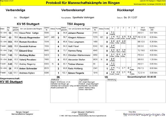 55kg - Johann Penner wurde Sieger durch Aufgabe. 120kg – Simon Fingerle, unser bestes Eigengewächs, zeigte wieder mal, wieso er so wertvoll für diese Mannschaft ist. Nach packenden 4 Runden konnte sich Simon mit technischer Überlegenheit feiern lassen. 60kg – Khagani Abasov traf auf den perfekt eingestellten Murtuz Magomedov, ein hoffnungsvolles Nachwuchstalent aus der Landeshauptstadt. Nach 5 hoch spektakulären Runden musste sich Khagani leider mit 3:2 Punkten geschlagen geben. 97kg – Radu Hohberg hatte mit Anton Schneider einen alten Bekannten als Gegner. Nach vier Runden musste sich Radu nach Punkten geschlagen geben. 66kg A – Timo Langmann traf auf den starken Roman Korolkov. Nach ausgeglichen Kampf im Stand musste sich Timo etwas unglücklich in der dritten Runde auf Schulter geschlagen geben. 84kg B – Sieger durch Aufgabe über Andrey Nagorny wurde Tobias Ulamec. 66kg B – Nichts zu lachen hatte Halit Yücel gegen Domink Kuhner. Schon die erste Aktion führte zur Schulterniederlage. 84kg A – Die schönste Flugphase hatte sicherlich Alexander Stefan gegen den starken Valerij Povalaev. Nach 1.28min und einem verkehrten Überwurf aus der Bodenlage musste sich Alex auf Schulter geschlagen geben. 74kg A – Hannes Rang, noch immer etwas angeschlagen, konnte gegen Eduard Graz nicht zu seiner alten Form auflaufen und unterlag durch technischer Überlegenheit. 74kg B – Mit 8kg Gewichtsnachteil startete Christian Wahlenmeier gegen Wolfgang Müller . Nach drei Runden musste sich Christian nach Punkten geschlagen geben. Eine Niederlage die sicherlich nicht hätte sein müsse, auch die Höhe von 26:15 ist sicherlich zu hoch. Nichts desto trotz hat der TSV Asperg I eigentlich den Klassenerhalt geschafft, ein Pünktchen würde zur absoluten Sicherheit reichen, und dieses Pünktchen wollen die Bären der Ersten Mannschaft kommenden Samstag im vorletzten Kampf der Saison in Nattheim ergattern. Auf mitfahrende Unterstützung würde sich die Mannschaft freuen. Danken wollten wir auch dem Chef vom Hamdan, der uns mit T-Shirts gesponsert hat.
