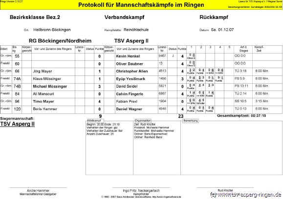 55kg – Kevin Henkel, ein Mannschaftsdebütant aus der eigenen Jugend wurde kampfloser Sieger. 120kg – Daniel Wagner ließ Boris Hammer keine Chance und gewann durch technische Überlegenheit. 60kg – Oliver Daubner ebenfalls ohne Gegner. 96kg – Fabian Prexl musste gegen Timo Mayer, dem wohl Besten der RG, in den Ring. Nach schönen Beginn musste er sich leider in der zweiten Runde auf Schulter geschlagen geben. 66kg – Christopher Allen zeigte in vier Packende Runden gegen Jörg Mayer großen Ringsport und gewann durch technische Überlegenheit. 84kg – Calvin Fingerle, Niemand kann unsere Konditionsmaschine stoppen. Auch Al Mansouri war nur ein Opfer. 74kgA – Eyüp „The Legend“ Yesilimark, wurde extra für diesen Kampf regeneriert und zeigte auf der Matte gegen Klaus Mössinger, dass er nichts verlernt hat. Glücklich und Stolz konnte er sich nach 4 Runden als Punktsieger feiern lassen. 74kgB – David Seidel musste im letzen Kampf sein können gegen Michael Mössinger unter Beweis stellen. Und obwohl er eigentlich, sicherlich der Bessere war, musste er eine Punktniederlage hinnehmen.