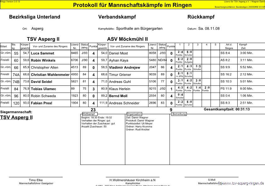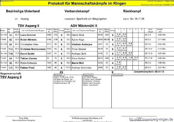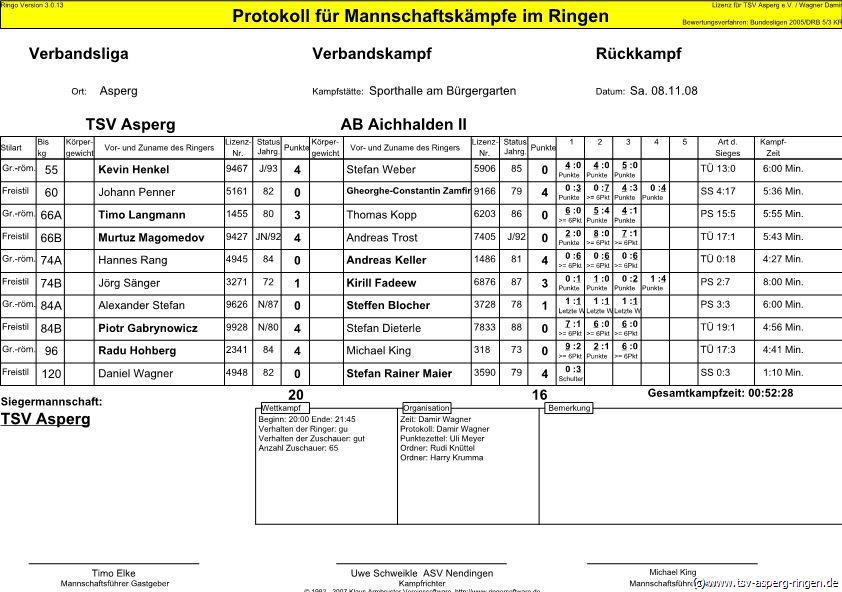55 kg G: Das Asperger Nachwuchstalent Kevin Henkel (A) war gegen Stefan Weber in jedem Moment klar der stärkere Mann und bescherte mit seinem Überlegenheitssieg den Aspergern einen gelungenen Start. 120 kg F: Eine Schulterniederlage musste Daniel Wagner (A) gegen Stefan Maier hinnehmen. 60 kg F: Drei Runden konnte Johann Penner (A) gegen den Bundesligaringer Gheorghe Zamfir dagegenhalten. In der vierten Runde konnte Zamfir seine Klasse durchsetzen und siegte entscheidend. 96 kg G: Radu Hohberg (A) gestaltete seinen Kampf gegen Michael King eindeutig und siegte mit überlegenem Punktevorsprung. 66 kg G: Seiner Bestform nähert sich Timo Langmann (A) zusehends. Unterlag Langmann im Vorkampf gegen Thomas Kopp noch deutlich beherrschte er nun im Rückkampf das Geschehen und feierte einen klaren Punktsieg. Nach fünf Kämpfen stand es 11:8 für die Heimmannschaft. 84 kg F: Stefan Dieterle gewann gegen Piotr Gabrynowicz (A) den ersten Wertungspunkt. Danach gab es für den Schwarzwälder nichts mehr zu holen, Gabrynowicz sammelte Punkt um Punkt und siegte technisch überlegen. 66 kg F: Murtuz Magomedov (A) legte gegen Andreas Trost gleich nach. Ebenfalls durch Überlegenheitssieg brachte Magomedov die Asperger in der Mannschaftswertung klar in Front. 84 kg G: Großer Jubel im Asperger Lager obwohl in drei Runden keine technische Wertung erzielt wurde. Alexander Stefan (A) hatte gegen den bärenstarken Steffen Blocher alles gegeben und nichts zugelassen. Nach diesem Kampf stand der dritte Sieg in Folge fest. 74 kg G: Gegen den starken Andreas Keller fand Hannes Rang kein Gegenmittel und unterlag nach Punkten. 74 kg F: Jörg Sänger (A) unterlag in einem Sehenswerten Kampf dem württembergischen Spitzenringer Kirill Fadeev mit 1:3 Runden. Erster Sieg für Asperg II
