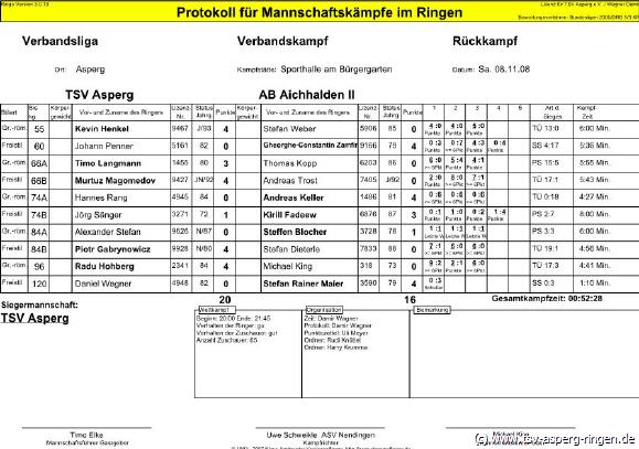 55 kg G: Luca Sammet (A) steigert sich von Kampf zu Kampf. Gegen Daniel Most gelang dem jungen Asperger ein beeindruckender Schultersieg. 120 kg F: Wie im Vorkampf war Fabian Prexl (A) gegen Andreas Schneider der überlegende Ringer und siegte auf Schulter. 60 kg F: Freistil ist die Stilart von Robin Winkels (A). Gegen Ayhan Kaya konnte der Asperger dieses unter Beweis stellen und siegte in der 2. Runde durch Aufgabe. 96 kg G: Robin Schweda (A) hatte mit Bernd Moll einen starken Gegner und verlor entscheidend. Nach vier Kämpfen stand es 12:4 für die Heimmannschaft. 66 kg G: Christopher Allen (A) musste nach zwei gewonnenen Runden gegen Vladimir Andrejew in der dritten Runde eine unglückliche Schulterniederlage hinnehmen. 84 kg F: Tobias is back. Allein schon seine Anwesenheit gab der jungen Asperger Mannschaft den nötigen Kick. In einem schönen Kampf besiegte Tobias Ulamec (A) Klaus Herlein mit 3:1 Punkten. 74 kg F: Christian Wahlenmaier (A) besiegte Timur Greiner in der zweiten Runde auf Schulter und stellte dadurch den Mannschaftserfolg vorzeitig sicher. 74 kg G: Nach zwei gewonnenen Runden besiegte David Seidel (A) Andreas Guhl auf Schulter.