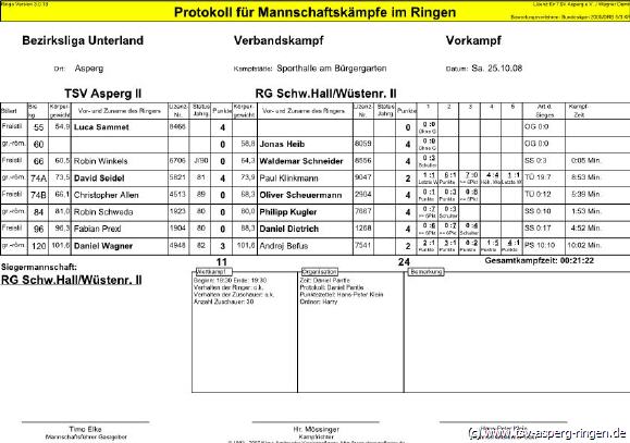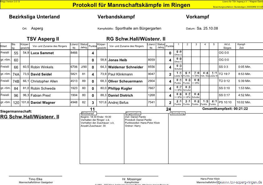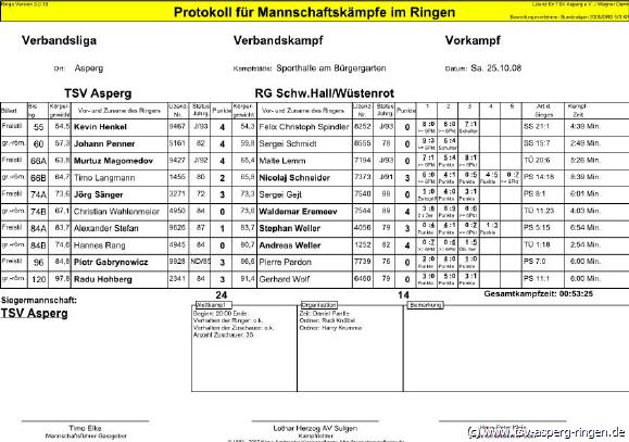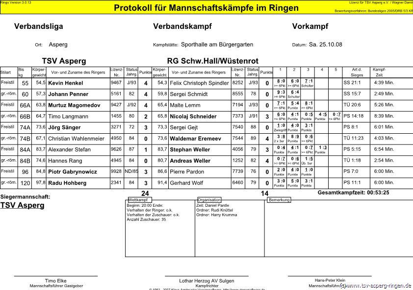 Im vorgezogenen Kampf konnte der Asperger Timo Langmann (66 kg Gr) die ersten beiden Runden für sich entscheiden. In der dritten Runde wendete sich das Kampfgeschehen und Nicolai Schneider konnte den Kampf noch mit 3:2 Runden für sich entscheiden. Ebenfalls vorgezogen wurde der Kampf in der Gewichtsklasse 84 kg Greco. Hannes Rang (A) musste am Ende die Überlegenheit von Andreas Weller hinnehmen. Wieder in überragender Form präsentierte sich Kevin Henkel (55 kg F) gegen Felix Spindler. Nach drei überlegen geführten Kampfrunden siegte Henkel auf Schulter. In einem Schlüsselkampf setzte der seit Wochen in Hochform ringende Radu Hohberg (120 kg Gr) gegen Gerhard Wolf mit einem umjubelten Punktsieg ein erstes Ausrufezeichen. Im letzten Kampf vor der Pause stand Johann Penner (60 kg Gr) dem Haller Sergei Schmidt gegenüber. In einem spannenden und äußerst abwechslungsreichen Kampf siegte Penner in der zweiten Runde auf Schulter. Stand nach 5 Kämpfen 13 : 7 Den zweiten Teil des Kampfabends eröffnete Piotr Gabrynovic (96 kg F) mit dem zweiten Schlüsselkampf des Abends. Sein Gegenüber Pierre Pardon konnte an diesem Abend versuchen was er wollte, Gabrynovic wusste immer eine bessere Antwort und siegte klar nach Punkten. Murtuz Magomedov (66 kg F) hatte es gegen Malte Lemm in den Händen den Mannschaftserfolg bereits vorzeitig zu sichern. Mit schönen technischen Wertungen gelang dem Asperger Jungtalent der befreiende Überlegenheitssieg. Alexander Stefan (84 kg F) konnte gegen den ehemaligen Bundesligaringer Stephan Weller eine Runde für sich entscheiden, musste aber Weller den Punktsieg überlassen. Jörg Sänger (74 kg F) rundete mit einem klaren Punktsieg gegen Sergei Gejt das gute Mannschaftsergebnis ab. Im letzten Kampf trat Christian Wahlenmeier (74 kg Gr) gegen Waldemar Eremeev an. Die punktreiche Begegnung konnte Eremeev schließlich für sich entscheiden.