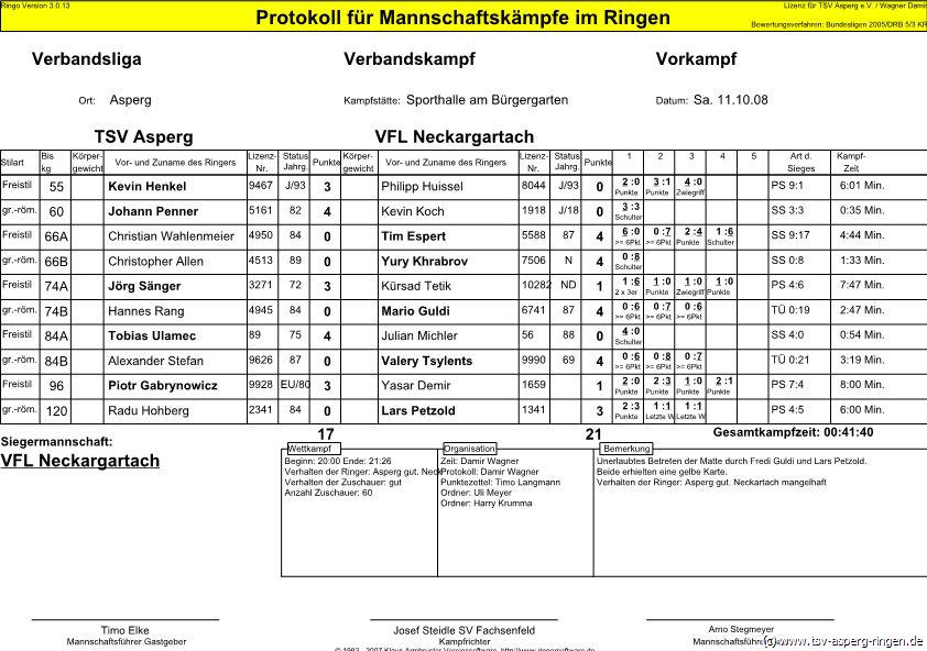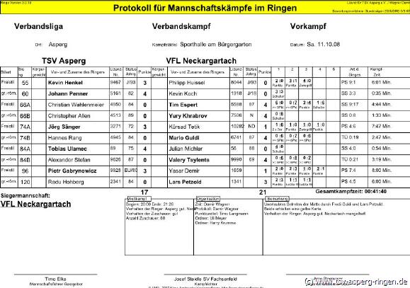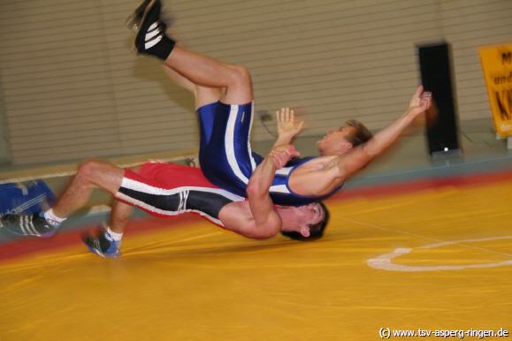 Kevin Henkel (55/FS) kontrollierte den Kampf gegen Philipp Huissel in allen Belangen und siegte verdient nach Punkten. Radu Hohberg (120/GR) hatte mit Lars Petzold einen erfahrenen Mann als Gegner. Nach starkem Kampf unterlag der Asperger nur knapp nach Punkten. Johann Penner (60/GR) ließ Kevin Koch keine Chance und siegte nach lediglich 35 Sekunden auf Schulter. Der erneut aufgerückte Piotr Gabrynowicz (96/FS) traf in einem Spitzenduell auf Yasar Demir. Trotz 11kg Gewichtsnachteil dominierte der Asperger seinen Gegner und gewann verdient mit 3:1 Runden. Christian Wahlenmeier(66/FS) dominierte in der ersten Runde Tim Espert nach Belieben. Ab der zweiten Runde verlor Wahlenmeier sein Konzept und musste sich sogar in der vierten Runde nach einer Unachtsamkeit auf Schulter geschlagen geben. Wieder zurück im Team war Alexander Stefan (84/GR) der mit Valery Tsylents einen Ausnahmeathleten als Widersacher hatte. Trotz starker Kampfleistung konnte Stefan einen Überlegenheitssieg nicht verhindern. Christopher Allen (66/GR) konnte gegen Yury Khrabrov im Stand noch gut mithalten. Im Boden zeigte der Neckargartacher aber seine Klasse und bezwang Allen entscheidend. Ebenfalls mit Gewichtsnachteil startete Tobias Ulamec (84/FS) gegen Julian Michler. Noch in der ersten Runde sicherte sich Ulamec einen überlegenen Schultersieg. Jörg Sänger (74/FS) hatte mit Kürsad Tetik einen unangenehmen Gegner zu ringen. Der Asperger Freistilexperte zeigte aber seine ganze Klasse und gewann mit 3:1 Punkten. Vor dem letzten Kampf des Abends stand es nun 17:17 und die Chancen für Hannes Rang (74/GR) gegen den württembergischen Spitzenringer Mario Guldi waren gering. Rang musste im folgenden die Überlegenheit des Neckargartacher anerkennen.