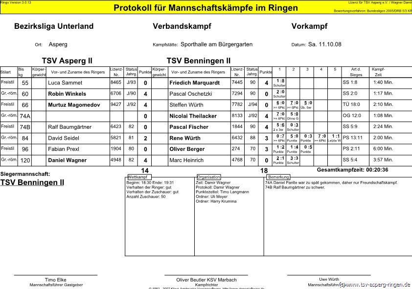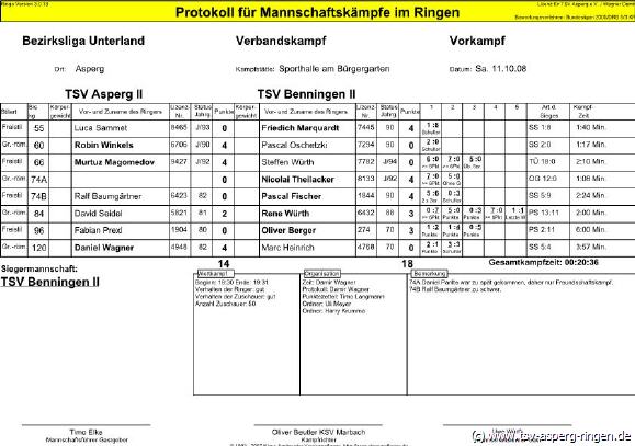 Die eigentlich bessere Mannschaft unterliegt dem Kontrahenten aus Benningen. Luca Sammet (55/FS) verliert entscheidend gegen Friedrich Marquard. Daniel Wagner (120/GR), Punktegarant in der zweiten Mannschaft, schultert Marc Heinrich in der zweiten Runde. Robin Winkels (60/GR) dominiert den Kampf gegen Pascal Oschetzki und gewinnt noch in der ersten Runde auf Schulter. Fabian Prexl (96/FS) verliert nach einem spannenden Kampf nach Punkten gegen Oliver Berger. Murtuz Magomedov (66/GR) gewinnt gegen Steffen Würth durch technische Überlegenheit. David Seidel (84/GR) verliert nach packendem Kampf mit 2:3 Punkten gegen Rene Würth. Daniel Pantle (74/GR) gewinnt zwar klar gegen Nicolai Theilacker, wird aber nicht gewertet, da Pantle zu spät zum Abwiegen kam. Ralf Baumgärtner (74/FS) muss die Punkte wegen Übergewicht an seinen Kontrahenten Pascal Fischer abgeben.