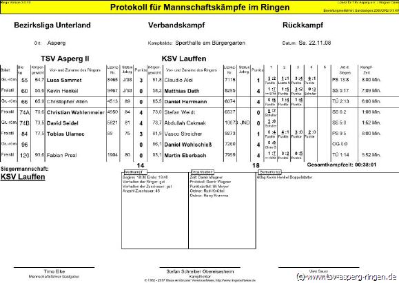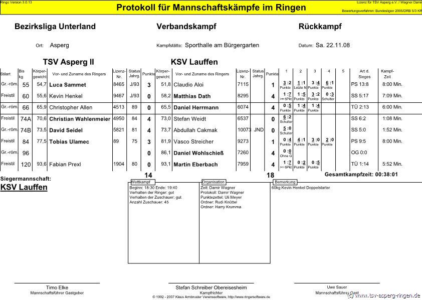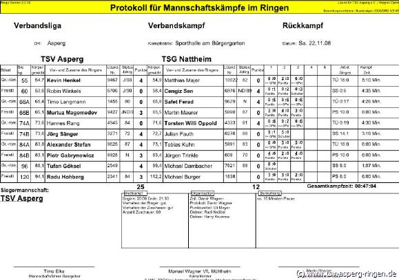 55 kg G: Kevin Henkel (A) beherrschte Matthias Majer in drei Runden deutlich und siegte durch technische Überlegenheit. 120 kg F: Radu Hohberg (A) war gegen den 18 kg schwereren Michael Burger ins Schwergewicht aufgerückt. Taktisch clever siegte Hohberg in drei Runden. 60 kg F: Robin Winkels (A) kämpfte gegen Cengiz Sen beherzt. Der junge Asperger wurde in der dritten Runde jedoch von Sen abgefangen und geschultert. 96 kg G: Tufan Göksel (A) zog gegen Michael Dambacher einen schulbuchmäßigen Hüftschwung und gewann noch in der ersten Runde auf Schulter. 66 kg G: Timo Langmann (A) hatte mit Safet Ferad einen Gegner, der noch im letzten Jahr in Aalen auf der Bundesligamatte kämpfte gegen sich. Der Überlegenheitssieg von Ferad war durchaus nicht überraschend. Nach fünf Kämpfen stand es 11:8 für den TSV Asperg. 84 kg F: Gegen den routinierten Jürgen Trinkle ließ Piotr Gabrynowicz (A) nichts anbrennen und siegte in drei Runden nach Punkten. 66 kg F: Murtuz Magomedov (A) bestimmte das Kampfgeschehen gegen Martin Maurer in drei Runden eindeutig. 84 kg G: Alexander Stefan (A) konnte seine Stärken gegen Tobias Kuhn ausspielen und siegte durch technische Überlegenheit. 74 kg G: Kein probates Mittel fand Hannes Rang (A) gegen Torsten Oppold, Der Sieg des Nattheimers war jedoch nur noch Ergebniskosmetik. 74 kg F: Jörg Sänger (A) gab gegen Julian Fauth mächtig Gas und schulterte Fauth in Runde zwei.