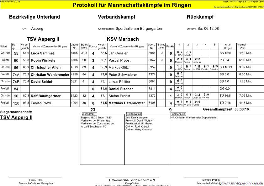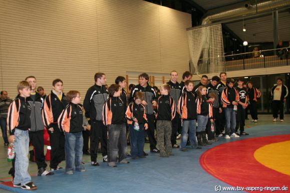 55 kg G: Luca Sammet (A) besiegte Jan Gessler in Runde Zwei auf Schulter. 120 kg F: Fabian Prexl (A) musste sich Matthias Hafenrichter beugen. 60 kg F: Robin Winkels (A) errang gegen Pascal Probst einen 3:0 Punktsieg. 96 kg G: Erstmals nach seiner verletzungsbedingten Pause stand Ralf Baumgärtner auf der Matte und siegte gegen Stefan Probst beeindruckend. 66 kg G: Chistopher Allen (A) lieferte sich gegen den starken Markus Götz einen abwechslungsreichen Kampf. Die Runden Eins und Drei gingen deutlich an Götz. In den Runden Zwei und Vier konnte Allen ausgleichen. In der entscheidenden Runde konnte Allen seinen Gegner schultern. 84 kg F: Hier stellte Asperg keinen Vertreter. 74 kg F: Christian Wahlenmeier (A) besiegte Peter Schwaderer auf Schulter. 74 kg G: Im letzten Kampf siegte David Seidel (A) gegen Lukas Pfeffer ebenfalls auf Schulter.