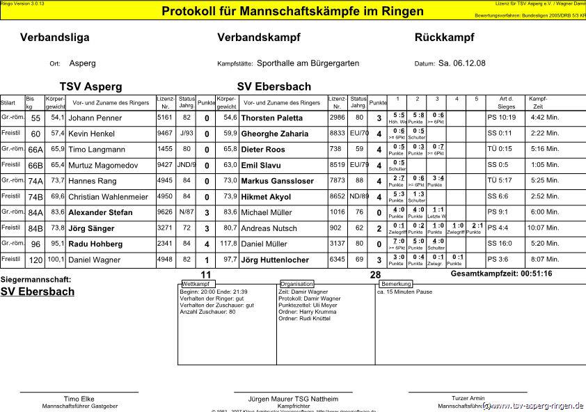 55 kg G: Johann Penner (A) hatte Thorsten Paletta in einer Situation kurz vor einer Schulterniederlage, musste jedoch drei Runden abgeben. 120 kg F: Daniel Wagner (A) siegte in der ersten Runde, die weiteren Runden gingen jedoch an Jörg Huttenlocher . 60 kg F: Gegen den erfahrenen Gheorge Zaharia musste der jugendliche Kevin Henkel (A) Lehrgeld zahlen und unterlag auf Schulter. 96 kg G: Radu Hohberg (A) hatte gegen Daniel Müller schon auf der Waage gewonnen. Auf der Matte wiederholte Hohberg den Sieg durch technische Überlegenheit eindrucksvoll. 66 kg G: Timo Langmann (A) hatte mit Dieter Roos einen schweren Gegner. Langmann musste sich dem ehemaligen Bundesligaass in drei Runden beugen. Nach fünf Kämpfen stand es 5:14 für die Gäste. 84 kg F: Jörg Sänger (A) lieferte sich mit Andreas Nutsch einen engen und äußerst spannenden Kampf. Am Ende behielt der Asperger mit 3:2 die Oberhand. 66 kg F: Auch Murtuz Magomedov (A) musste gegen Emil Slavu Lehrgeld zahlen und unterlag auf Schulter. 84 kg G: Alexander Stefan (A) verpasste gegen Michael Müller nur knapp einen Überlegenheitssieg. Nach seinem 3:0 Sieg stand die Heimniederlage bereits fest. 74 kg G: Hannes Rang (A) konnte Markus Gansloser nicht aufhalten und unterlag in drei Runden. 74 kg F: Lange sah es so aus als würde Christian Wahlenmeier (A) gegen Hikmet Akyol einen Sieg erringen können. Der stets angreifende Wahlenmeier wurde von Akyol jedoch in der zweiten Runde durch einen Konter geschultert.