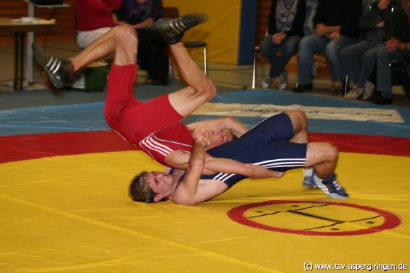 Jetzt erst Recht sagten sich die Asperger vor dem schweren Auswärtskampf in Weilimdorf. Schon die ersten drei Kämpfe waren für den dringend benötigten Auswärtserfolg maßgebend. Penner gegen Abbasov und Henkel gegen Lupo waren spannende und sehenswerte Auseinandersetzungen, die beide an die Asperger Ringer gingen. Mit den erwarteten souveränen Erfolgen von Hohberg und Magomedov sicherten sich die Asperger den benötigten Vorsprung zur Pause. Trotz Niederlage zeigte sich Grzeszczuk stark verbessert. Auch wenn es am Ende noch Mal eng wurde, auf Tracz konnte sich die Mannschaft verlassen. Die Kämpfe im Einzelnen. Johann Penner (55 kg) traf auf den ehemaligen Asperger Khagani Abbasov. In einer spannenden Begegnung ging die erste Runde technisch überlegen an Penner. Abbasov drehte in der zweiten Runde den Spieß um. Die dritte Runde ging knapp an Abbasov. In der vierten Runde gelang zuerst dem Heimringer eine Dreierwertung, dieser folgten zwei Dreierwertungen für Penner und der anschließende Schultersieg. Radu Hohberg (120 kg) traf überraschend auf Daniel Möbius. Hohberg setzte von Beginn an sein Konzept um und siegte in drei Runden durch technische Überlegenheit. Kevin Henkel (60 kg) traf auf den starken Adrian Lupo. Die ersten beiden Runden gingen klar an Henkel. Die anschließenden zwei Runden drehte Lupo das Ergebnis. Somit musste in der fünften Runde der Sieger ermittelt werden. Hier war wieder Henkel der Stärkere und siegte mit 3:2 Runden. Piotr Gabrynowicz (96 kg) wurde kampfloser Sieger. Auch Murtus Magomedov (66 kg F) traf auf einen ehemaligen Asperger. Abdulla Eren musste allerdings alle Runden an Magomedov abgeben. In der dritten Runde gelang Magomedov ein Schultersieg. Zur Pause stand es 2:19 für den TSV Asperg. Robin Schweda (84 kg G) konnte gegen Michael Berner die Schulterniederlage nicht vermeiden. Timo Langmann (66 kg G) traf auf Tomasz Kierpiec. Im Laufe der ersten Runden zog sich Langmann eine Verletzung zu, die ihn zur Aufgabe zwang. Michal Grzeszczuk (84 kg F) stand dem ehemaligen Botnanger Bundesligaringer Markus Laible gegenüber. In diesem Kampf wurden die Nerven der Anhänger beider Seiten arg strapaziert. Die ersten Runden gewann Laible knapp. In den nächsten Runden legte Grzeszczuk nach und glich nach Runden aus. Beide Kämpfer legten ihre letzten Reserven in die entscheidende fünfte Runde. Laible nutzte seine Routine, zog eine Schleuder aus der sich Grzeszczuk nicht mehr befreien konnte und bescherte der SG einen unerwarteten Schultersieg. Christopher Allen (74 kg F) konnte dem Weilimdorfer Spitzenmann Stefan Vogt nicht lange standhalten und verlor entscheidend. Vor dem letzten Kampf stand es 18:19, der letzte Kampf des Abends musste die Entscheidung bringen. Mieczyslaw Tracz (74 kg G) suchte gegen Giovanni Simone eine rasche Entscheidung. Sein Schultersieg nach nur 25 Sekunden brachte Asperg den verdienten Auswärtserfolg.